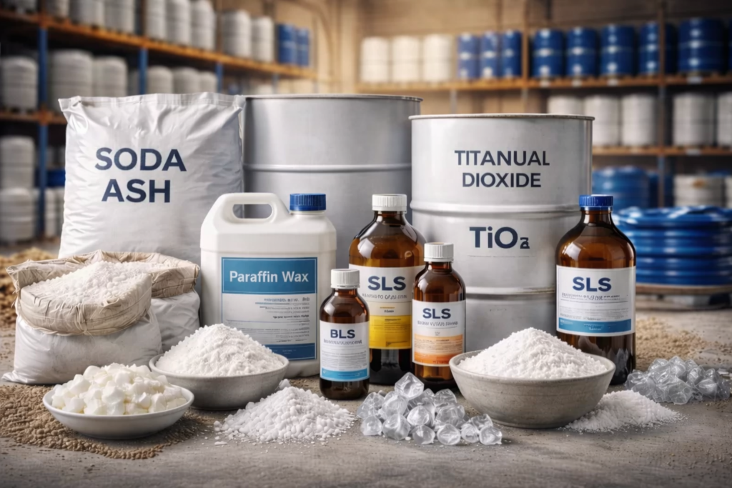 Core manufacturing inputs — Paraffin Wax, SLS, TiO2, Soda Ash and more for production-grade applications across India.