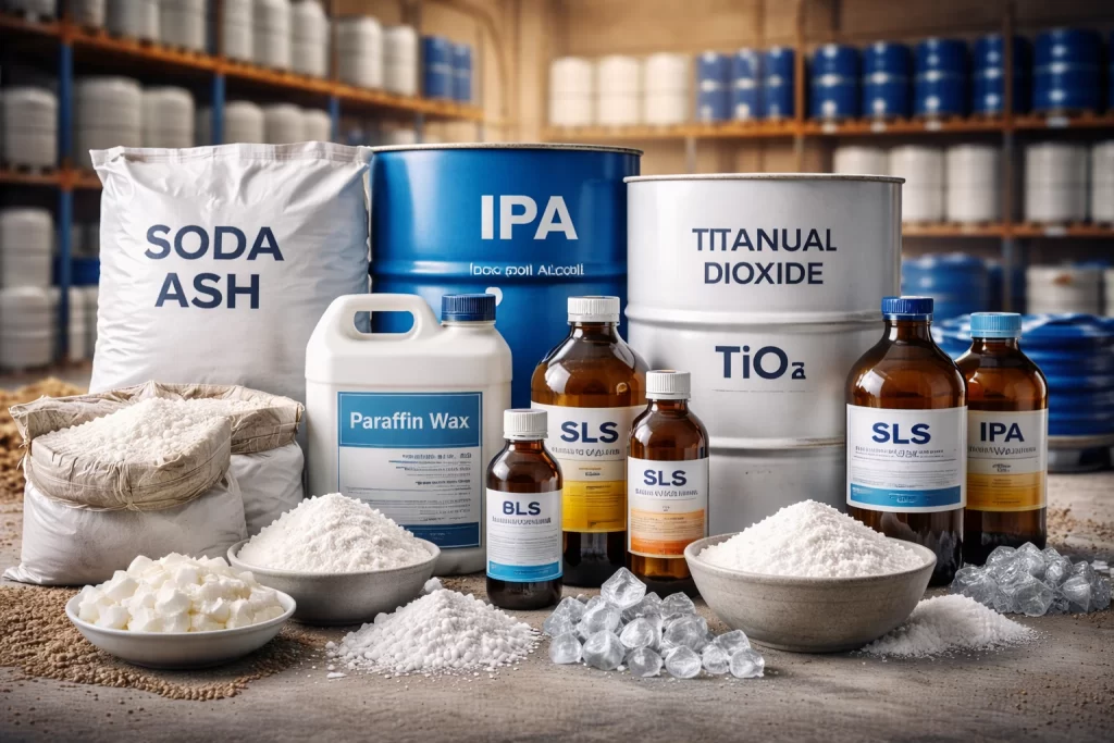 Core manufacturing inputs — Paraffin Wax, IPA, SLS, TiO2, Soda Ash and more for production-grade applications across India.